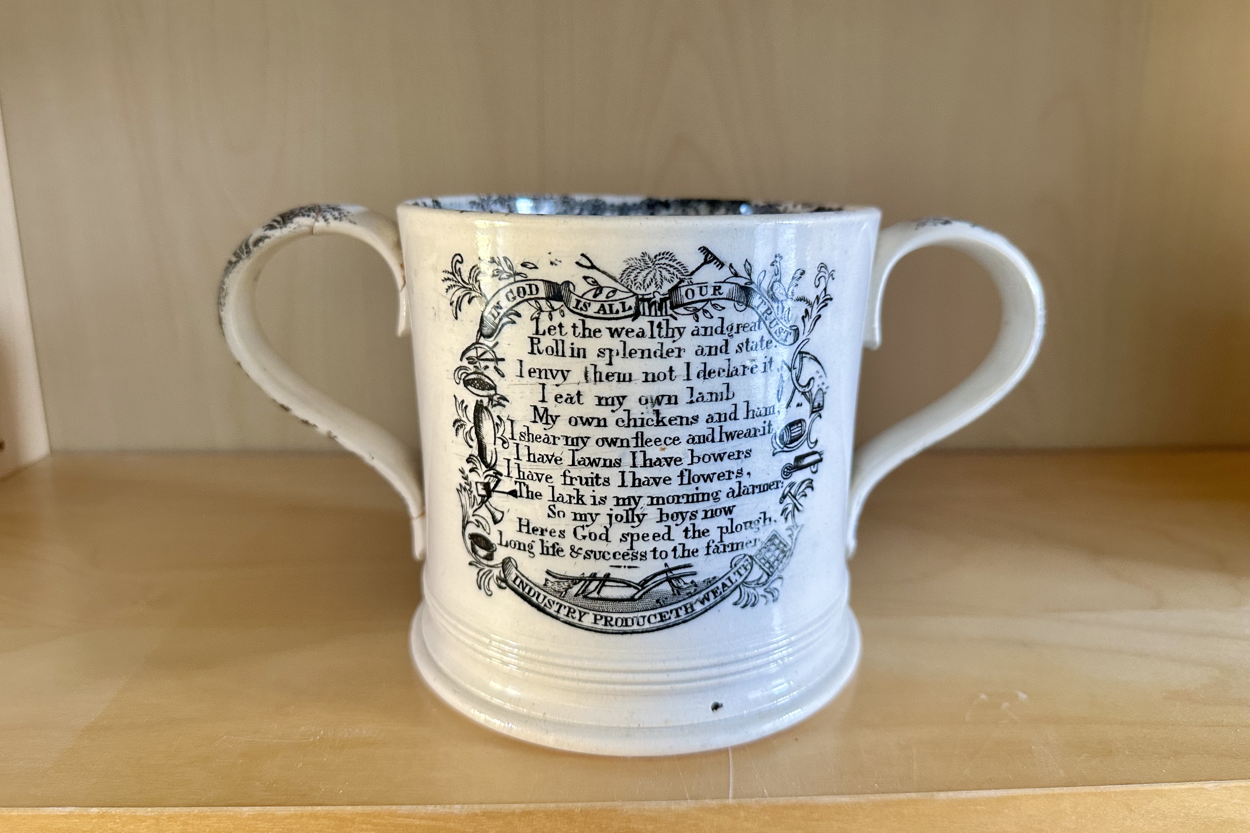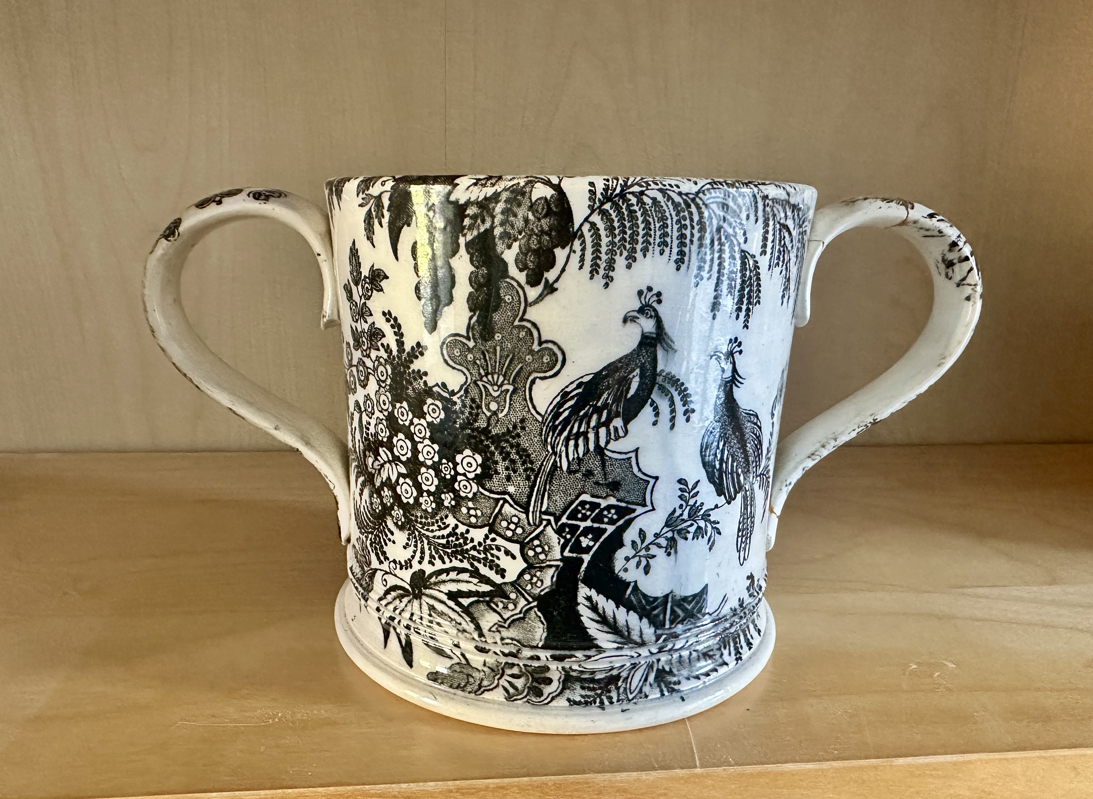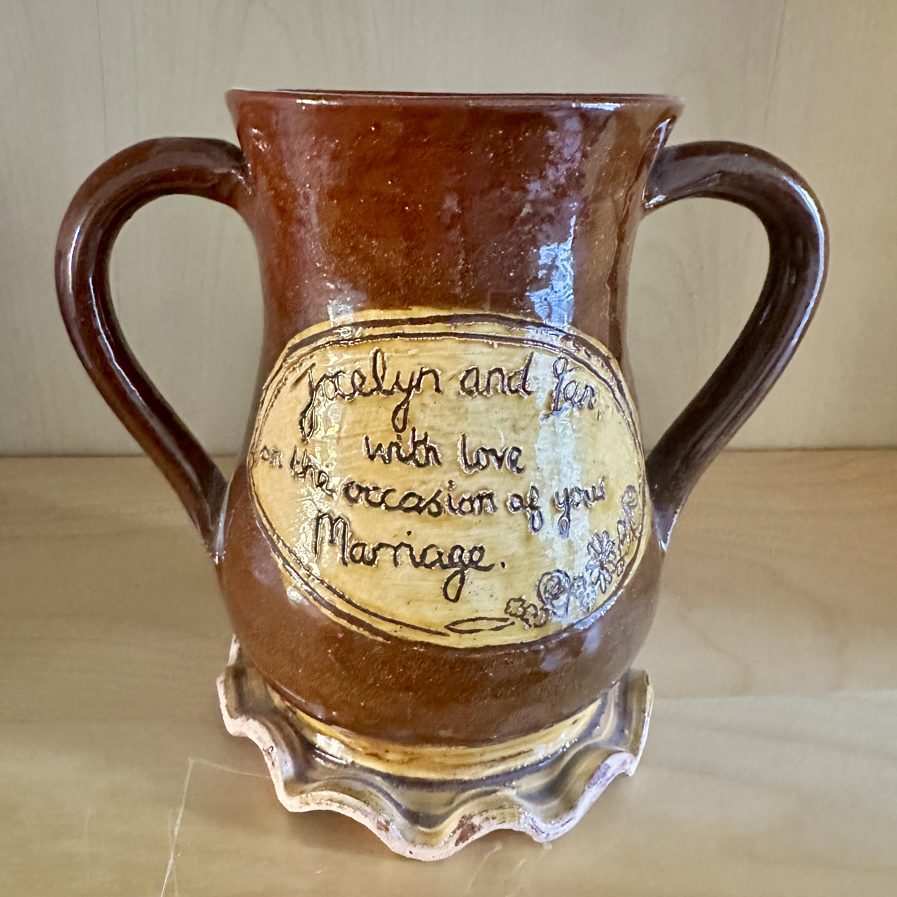 The older of the two is a Victorian piece, ceramic, with the characteristic two-handled shape that makes a loving cup a loving cup — a vessel not for solitary drinking but for passing between hands. Claude tells me it dates from somewhere around 1820 to 1860, the sort of confident-sounding range that you can now obtain in seconds for any inherited object you choose to photograph. It belonged to my great-grandmother, Ellen “Nellie” Parkin, and reached me via my Mum. I don’t know whose wedding it marked, or indeed whether it ever marked a wedding at all.