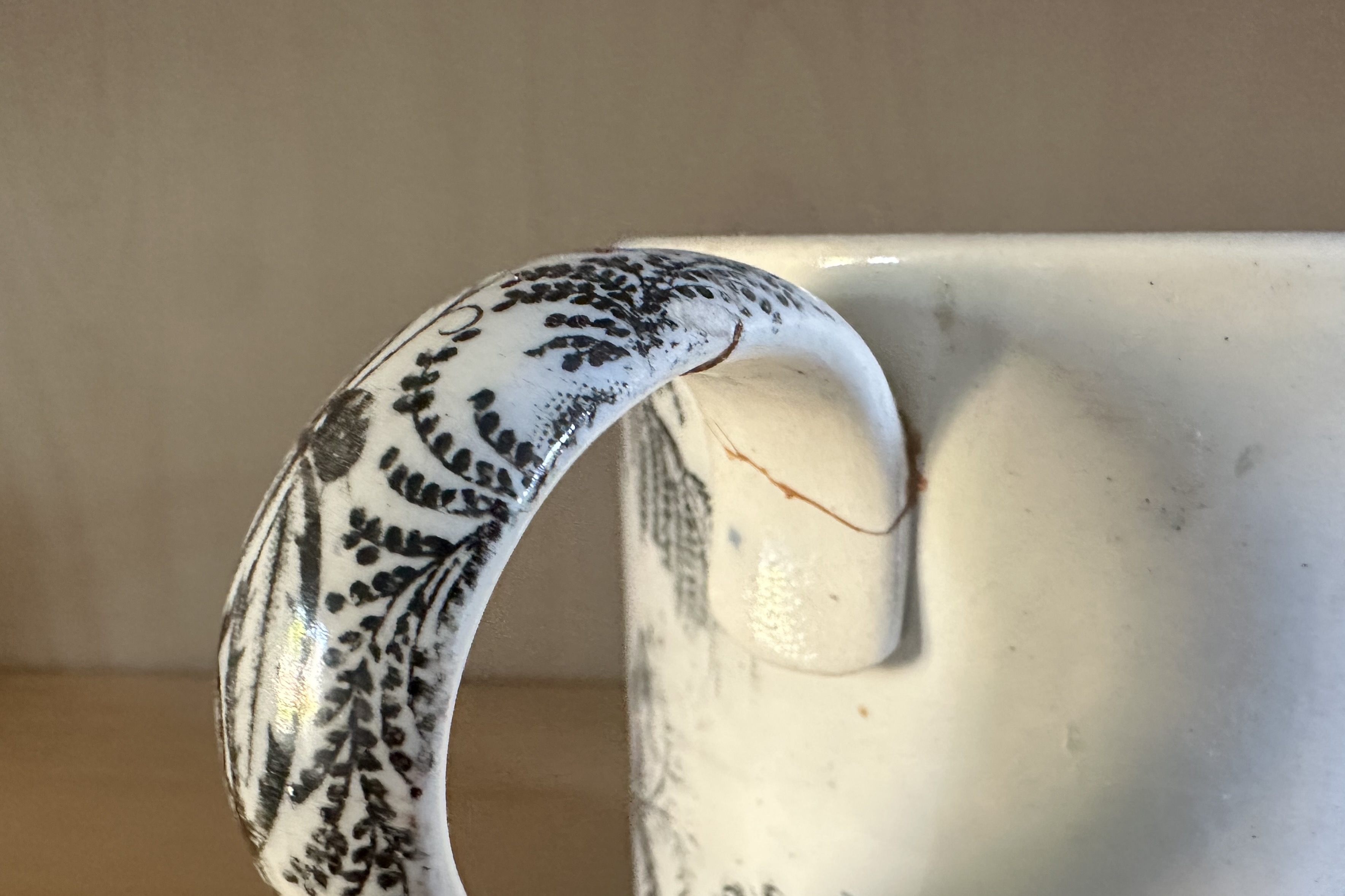 As I understand it, the Victorian cup, when it was made, would not have been a precious thing. Loving cups were common domestic ware in the nineteenth century, the sort of thing produced in volume by the Staffordshire potteries and given as a matter of course at weddings and christenings. I wonder how many of its contemporaries ended their days as fragments in landfill, or as the kind of battered curio that turns up at car boot sales for three quid. Mine has survived because someone in each generation decided it was worth keeping, and passed it along. That this someone included a small boy with butterfingers, living at a time of industrial adhesive, is just part of the cup’s story now — some additional character.
