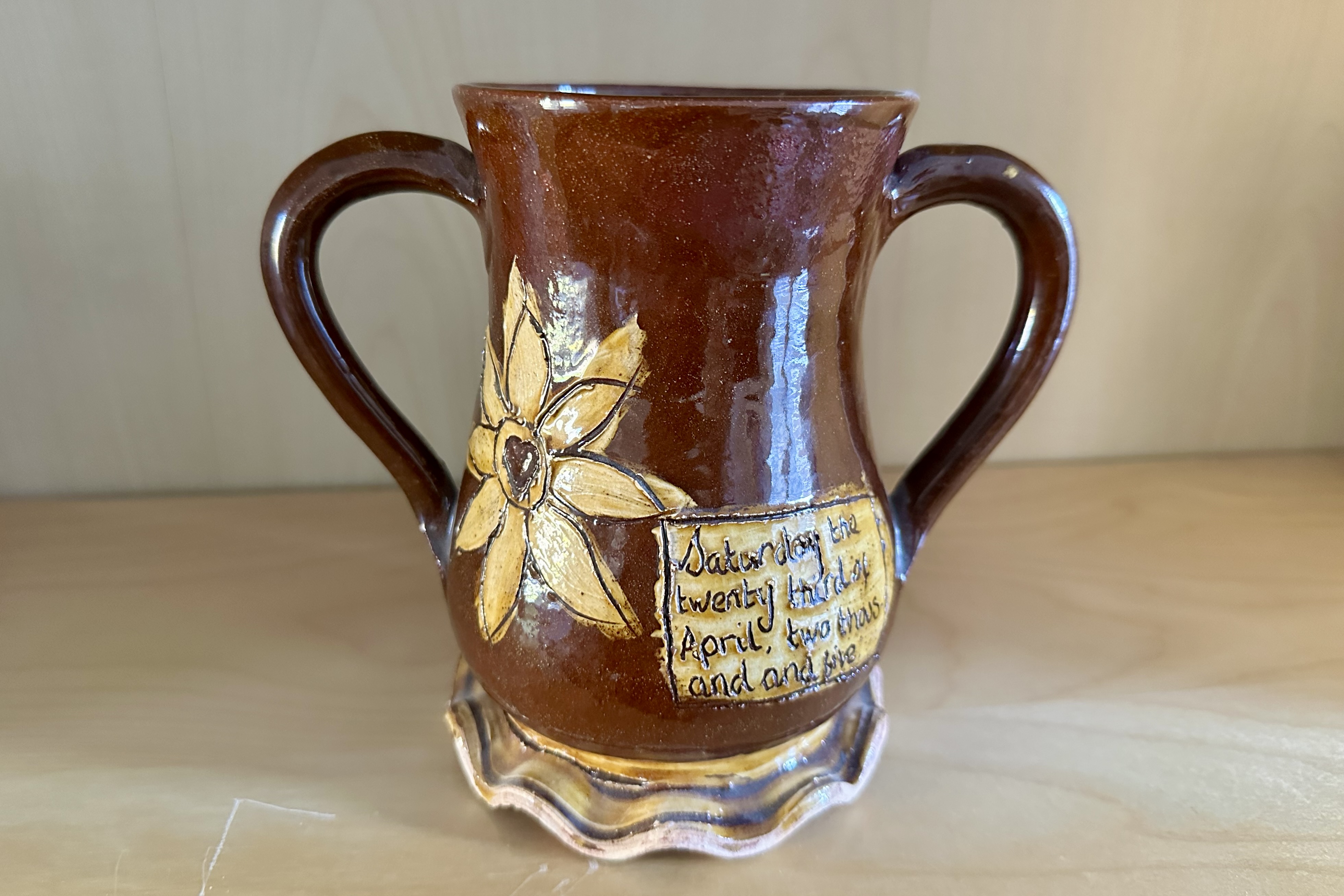 The younger cup is contemporary — a handmade piece given to Jocelyn and me on our wedding day by Dawn Sharkey, who was at the time the girlfriend of my friend Jammy. Being the same age as my marriage makes it a relative newcomer to the world of objects, but old enough that the relationship which produced it has long since dissolved. Dawn moved on. Jammy is no longer with us. The cup, indifferent to the lives of humans, sits on my shelf and continues to be a cup.