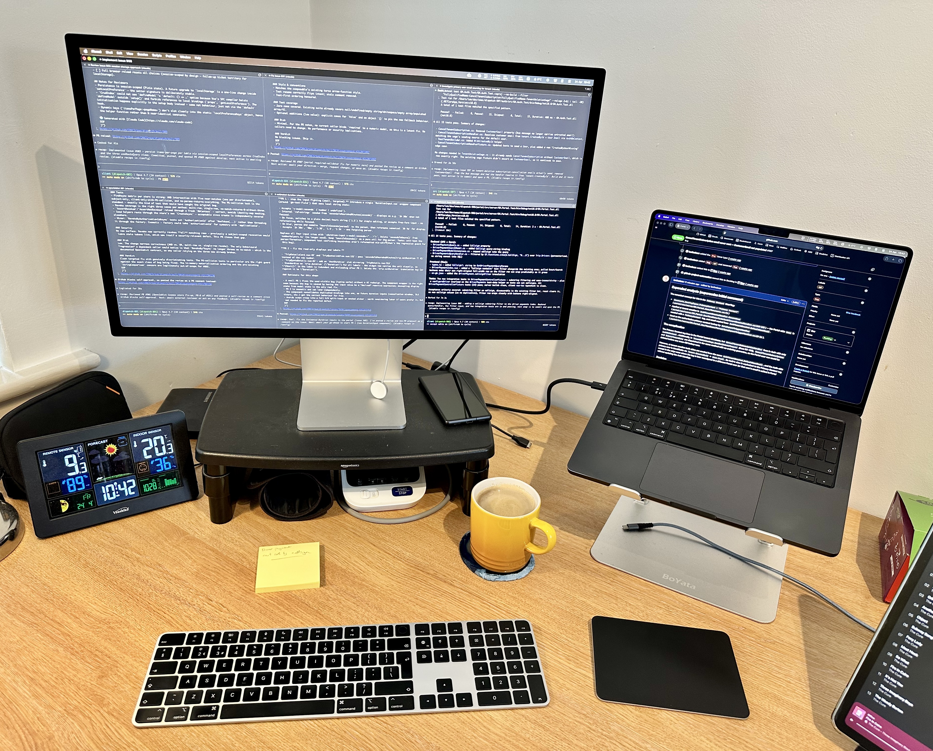 Here’s what my working setup looks like. My Studio Display has six terminal panes arranged in a grid. Each pane is a separate worktree of the project I’m currently working on, running a separate Claude Code session. One pane might be running a long refactor, another might be writing tests for a new feature, a third might be investigating a bug, a fourth might be updating documentation, and so on.
