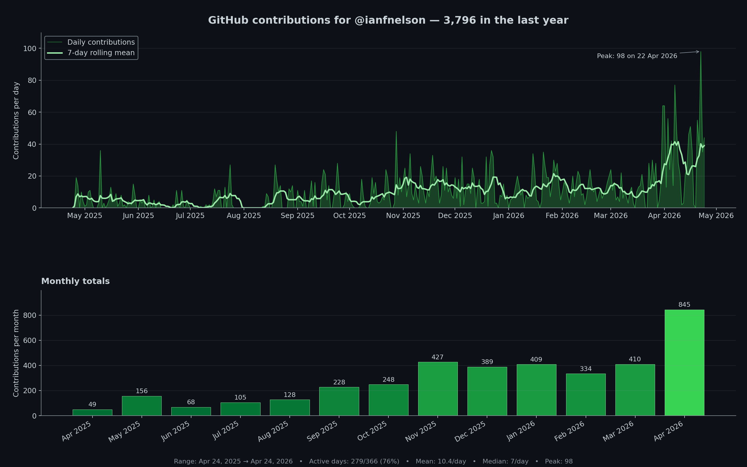 My GitHub contribution graph. Contribution count is, I concede, a crude proxy for productivity — it counts commits rather than judgement — but the shape of the graph quantifies something real about the shift I’ve been describing.